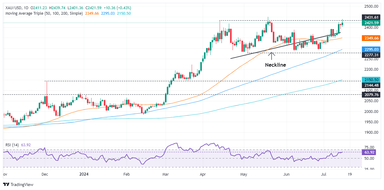 El metal amarillo abrió la sesión del lunes ligeramente a la baja tras el ataque de asesinato de Trump durante el fin de semana, lo que aumentó sus posibilidades de ganar las elecciones de noviembre. Esto impulsó al Dólar, aunque las preocupaciones se desvanecieron y el XAU/USD reanudó su tendencia alcista, elevando los precios del Oro hacia un máximo de varias semanas de 2.439$.