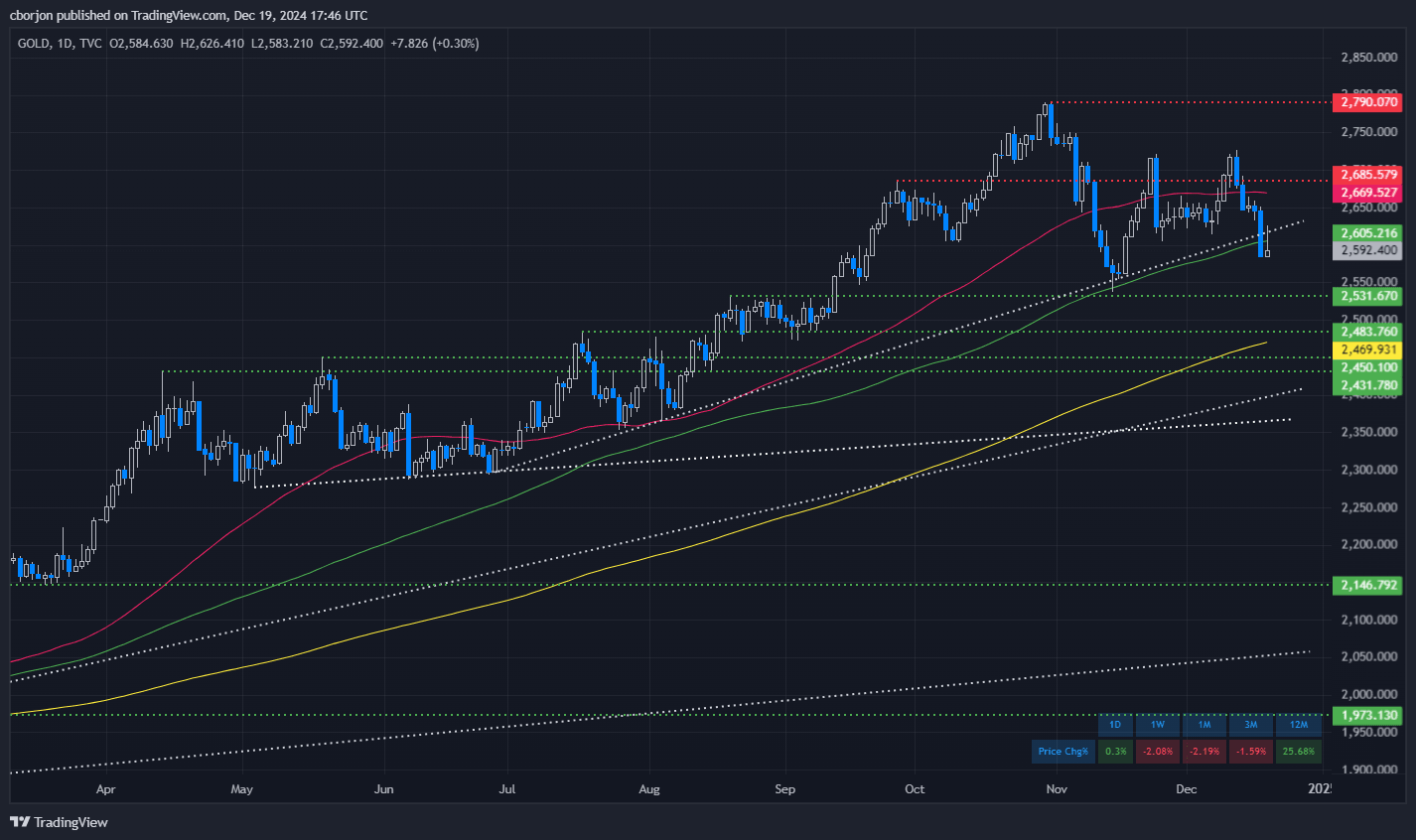El jueves, el precio del Oro recortó algunas de sus pérdidas del miércoles, registrando un tímido avance del 0,20%. La modesta ganancia del jueves sigue a la decisión de la Reserva Federal (Fed) de adoptar una postura más gradual, rechazando tres recortes de tasas de interés para 2025. El XAU/USD cotiza en 2.588 $ después de alcanzar un máximo diario de 2.626 $.