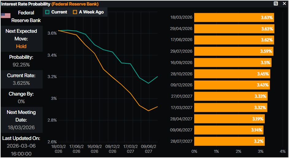 Mientras tanto, las cifras de Nóminas no Agrícolas de EE.UU. para febrero fueron desalentadoras, con la economía perdiendo más de 92K empleos, por debajo de las previsiones de creación de 59K empleos. La tasa de desempleo subió ligeramente al 4.4%, pero se mantuvo por debajo del 4.5% proyectado por la Reserva Federal para 2026.