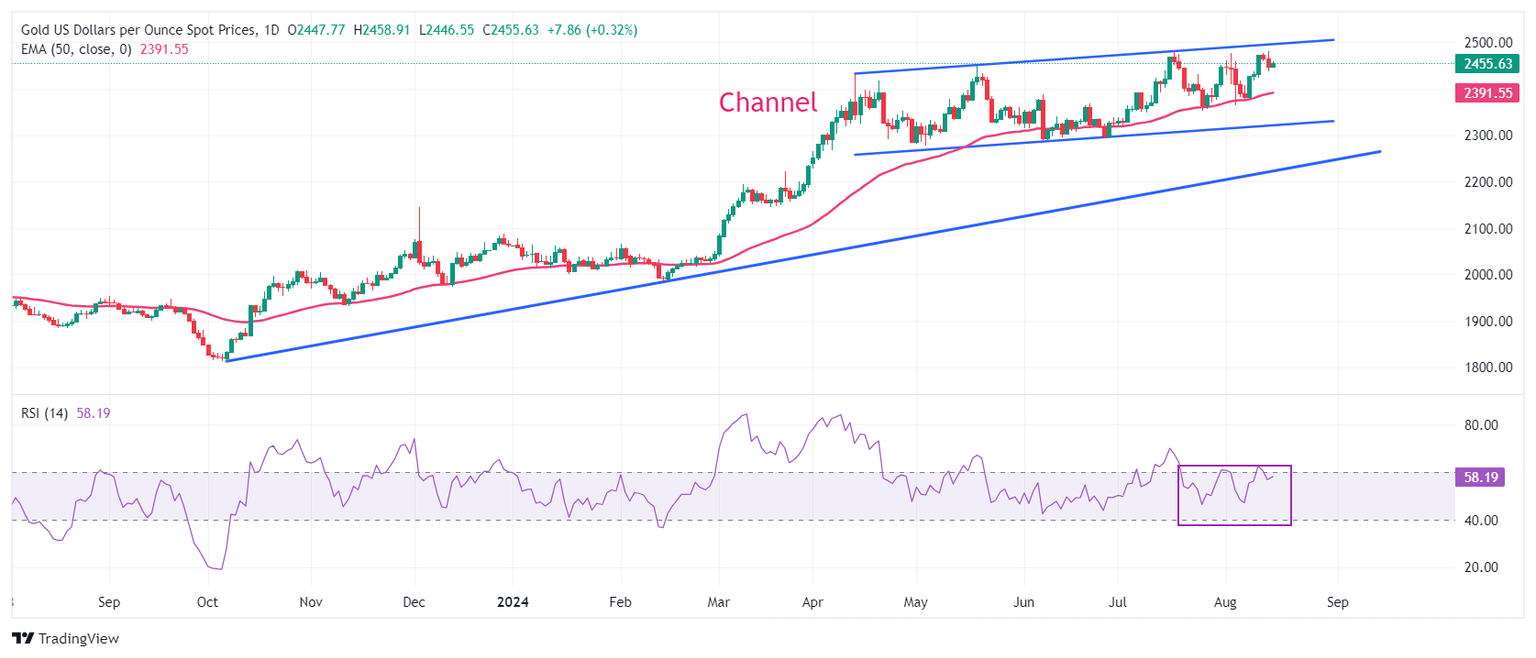 El precio del Oro cotiza en una formación de canal en un marco de tiempo diario, que está ligeramente en alza pero se ha movido lateralmente durante más de tres meses. La media móvil exponencial (EMA) de 50 días cerca de 2.390$ sigue proporcionando soporte a los alcistas del Oro.