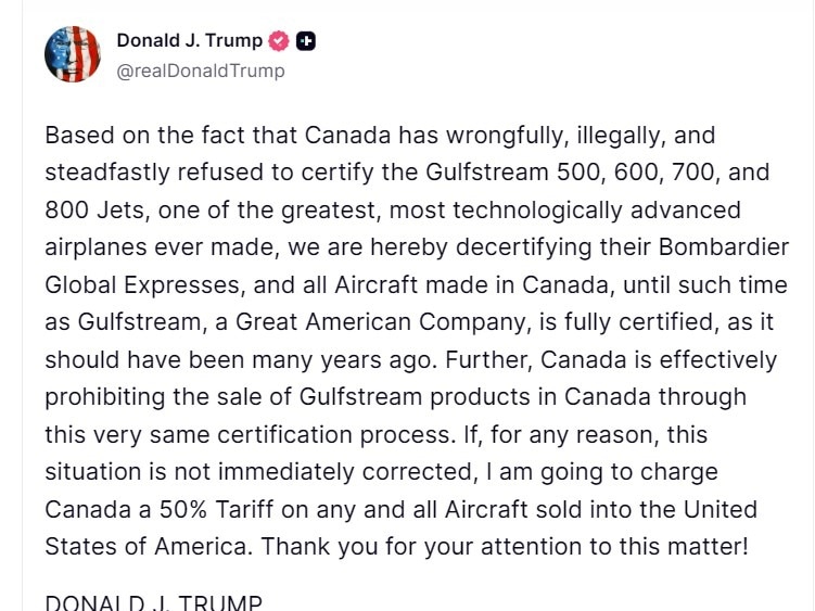El presidente de EE.UU., Donald Trump, amenazó el jueves con imponer un arancel del 50% a todos los aviones vendidos desde Canadá hacia Estados Unidos (EE.UU.), acusando a Canadá de bloquear injustamente la certificación de los jets de negocios Gulfstream.