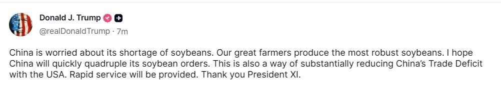 El presidente de EE.UU., Donald Trump, publicó el lunes en Truth Social que espera que China cuadriplique sus pedidos de soja a Estados Unidos (EE.UU.). Trump afirmó además que también era "una forma de reducir sustancialmente" el déficit comercial de Pekín con Washington.