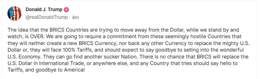 El presidente de EEUU.advierte sobre posibles aranceles del 100% si los BRICS intentan reemplazar al Dólar estadounidense