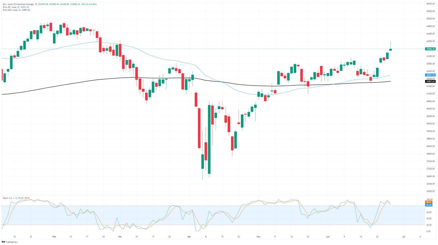 El impulso alcista continúa manteniendo los precios del DJIA en aumento, pero los osciladores técnicos sobrecomprados están mostrando señales de advertencia firmes de que un retroceso a la baja podría estar en camino. No se puede descartar un retroceso a corto plazo hacia la media móvil exponencial (EMA) de 50 días cerca de 42.200.
