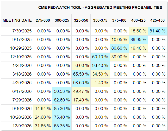Según la herramienta FedWatch del CME, los mercados de tasas ahora esperan una serie de tres recortes de tasas secuenciales de la Fed durante el resto de 2025, con el primer recorte de tasas ampliamente esperado en septiembre. Los operadores de tasas están valorando casi un 90% de probabilidades de un recorte de un cuarto de punto el 17 de septiembre, con más del 80% de probabilidades de un recorte de tasas adicional el 29 de octubre y alrededor del 60% de probabilidades de un tercer recorte de un cuarto de punto el 10 de diciembre.