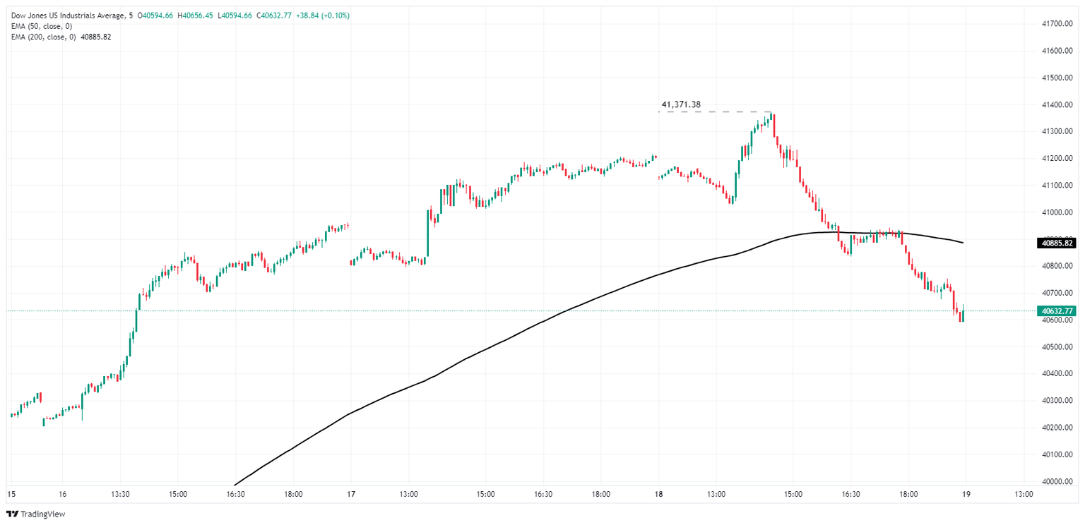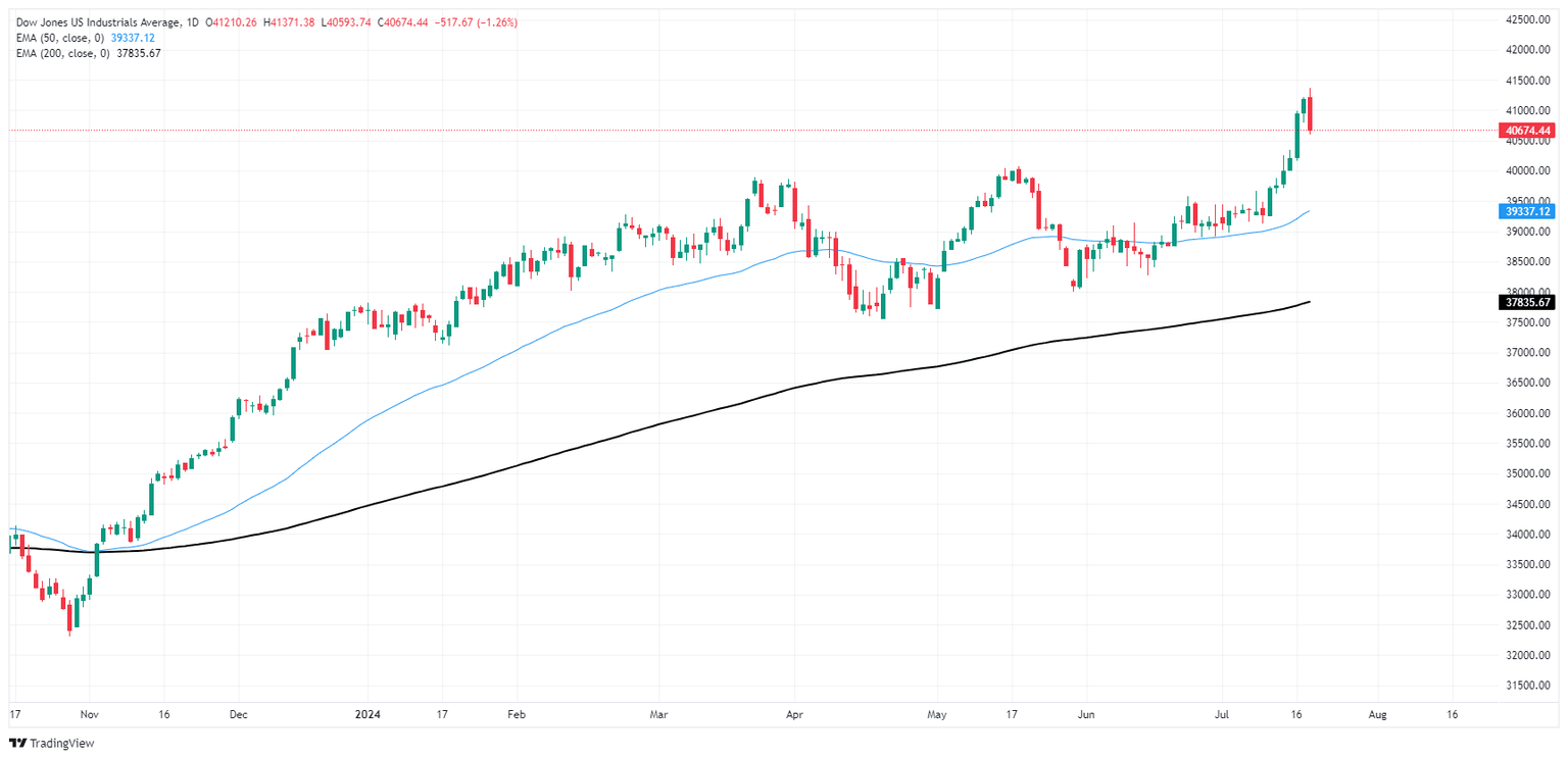 El Promedio Industrial Dow Jones (DJIA) subió a otro máximo histórico el jueves antes de girar a la baja y seguir al mercado más amplio en un suave retroceso que arrastró los precios intradía de vuelta al rango de mitad de semana. El Dow Jones está operando firmemente por encima de la zona de precios clave de 40.000,00 después de ser impulsado a máximos históricos por las expectativas de los inversores de un recorte de tasas en septiembre que se fijan en el techo.