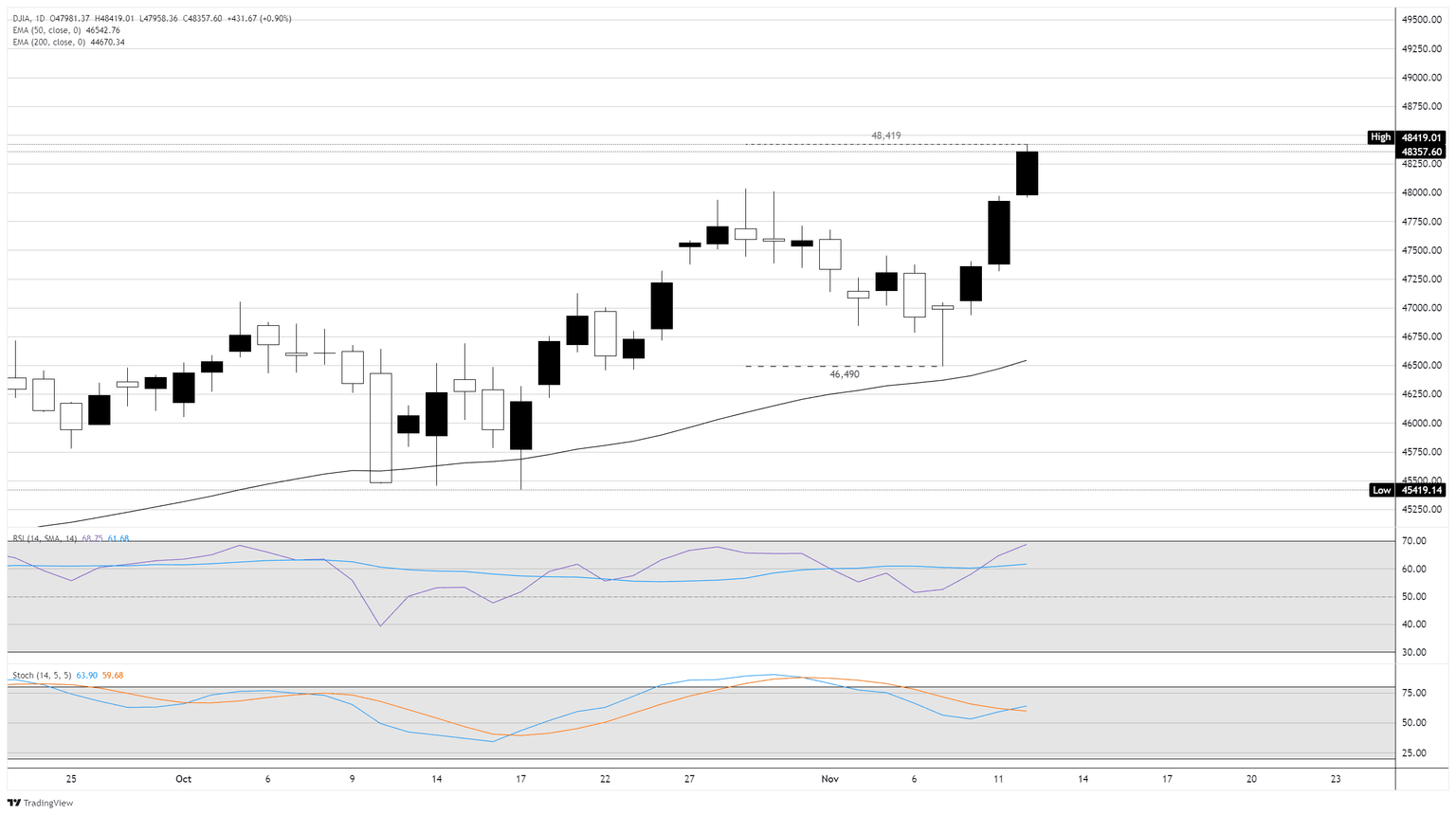 El Dow Jones subió alrededor de 430 puntos, estableciendo un nuevo máximo intradía de 48.419, ya que el índice mayor, con menos tecnología, recibe un impulso de los operadores que regresan a inversiones tradicionales. El Dow ahora ha subido alrededor del 4% en un período de cuatro días después de caer a 46.490 en un leve retroceso desde el último máximo histórico cerca de la zona de 48.000.