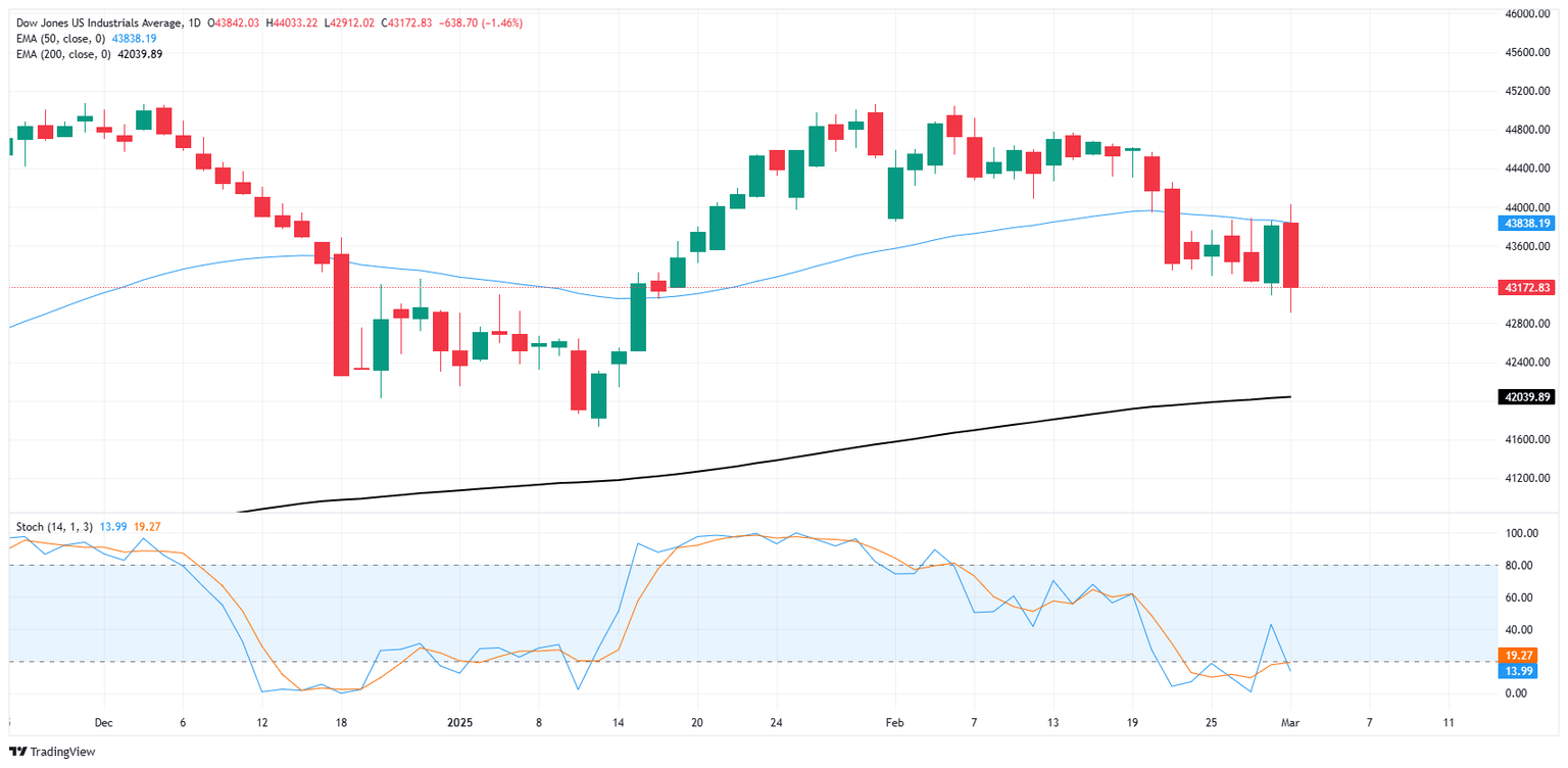El Promedio Industrial Dow Jones (DJIA) giró en un círculo preocupado el lunes, abriendo las puertas a una nueva semana de negociación y manteniéndose cerca del nivel de 43.800 antes de que las preocupaciones continuas de los inversores se apoderaran y arrastraran al DJIA a la baja en alrededor de 740 puntos en su punto más bajo, cerrando la sesión del mercado estadounidense del lunes con 640 puntos en rojo. El índice bursátil principal continúa generando un patrón cargado de volatilidad cerca de medias móviles clave mientras los inversores esperan la última iteración de las amenazas arancelarias del presidente de Estados Unidos (EE.UU.), Donald Trump. Paradójicamente, se afirma que los aranceles de Trump son tanto una táctica maestra de negociación del candidato de la plataforma republicana que en realidad no tiene la intención de imponer impuestos a la importación a sus propios ciudadanos, como también una forma críticamente necesaria de generación de ingresos para el gobierno de EE.UU. que se impondrá sin importar qué. La forma que tomen los aranceles tiende a depender de quién en la administración Trump esté hablando.