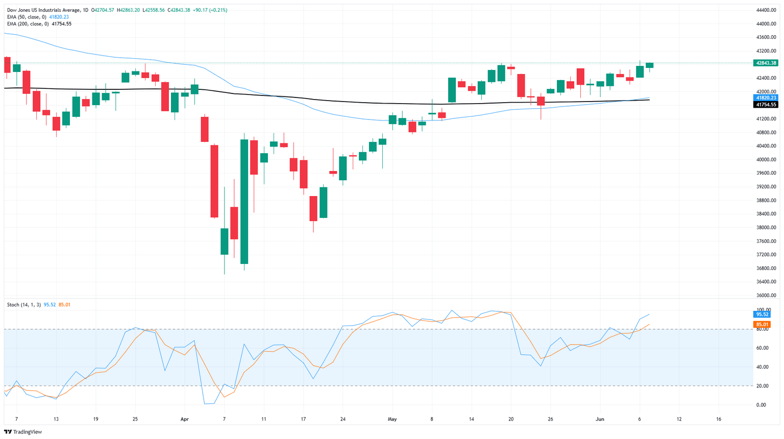 El Promedio Industrial Dow Jones (DJIA) continúa avanzando hacia el extremo superior de la reciente consolidación, acercándose a un techo técnico a corto plazo en el nivel de 43.000. La acción del precio se mantiene en el lado alto de la media móvil exponencial (EMA) de 200 días cerca de 41.650. El impulso alcista podría ver una pausa para tomar aire mientras los osciladores técnicos se inclinan hacia territorio de sobrecompra.