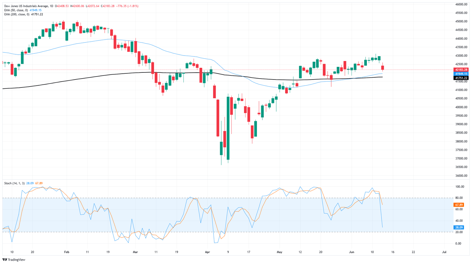 El Dow aún se negocia por encima de la media móvil exponencial (EMA) de 200 días cerca de 41.800, a pesar de la debilidad a corto plazo, y la EMA de 50 días está en proceso de completar un cruce alcista con la media móvil a largo plazo, lo que implica que podría haber una nueva pierna al alza si la acción del precio cumple con el soporte técnico de la zona de 42.000.