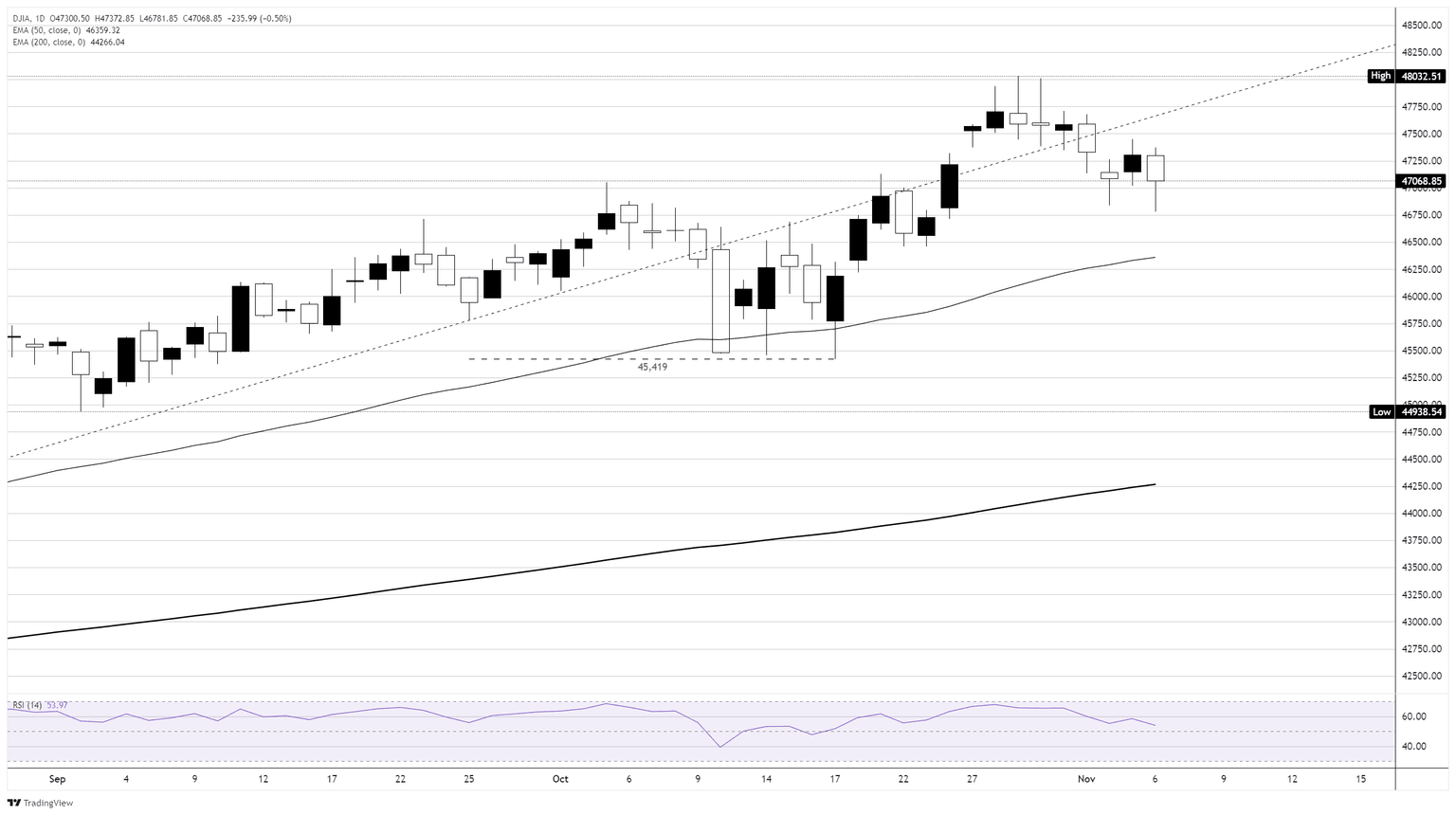 El Dow Jones probó de nuevo por debajo de la zona de 47.000, cayendo alrededor del 2.6% desde el pico hasta el mínimo después de registrar máximos históricos justo por encima de 48.000 a finales de octubre. Un declive general en las acciones tecnológicas está recibiendo una nueva mirada el jueves tras un primer desplome y una breve recuperación a mediados de semana. Salesforce (CRM), Nvidia (NVDA) y Microsoft (MSFT) están todos en rojo por el día mientras los inversores comienzan a examinar más de cerca si las valoraciones astronómicas y los ratios P/E a futuro medidos en siglos para los proveedores de tecnología de centros de datos pueden seguir justificándose ante la aún mítica generación de ingresos de los proyectos de IA.