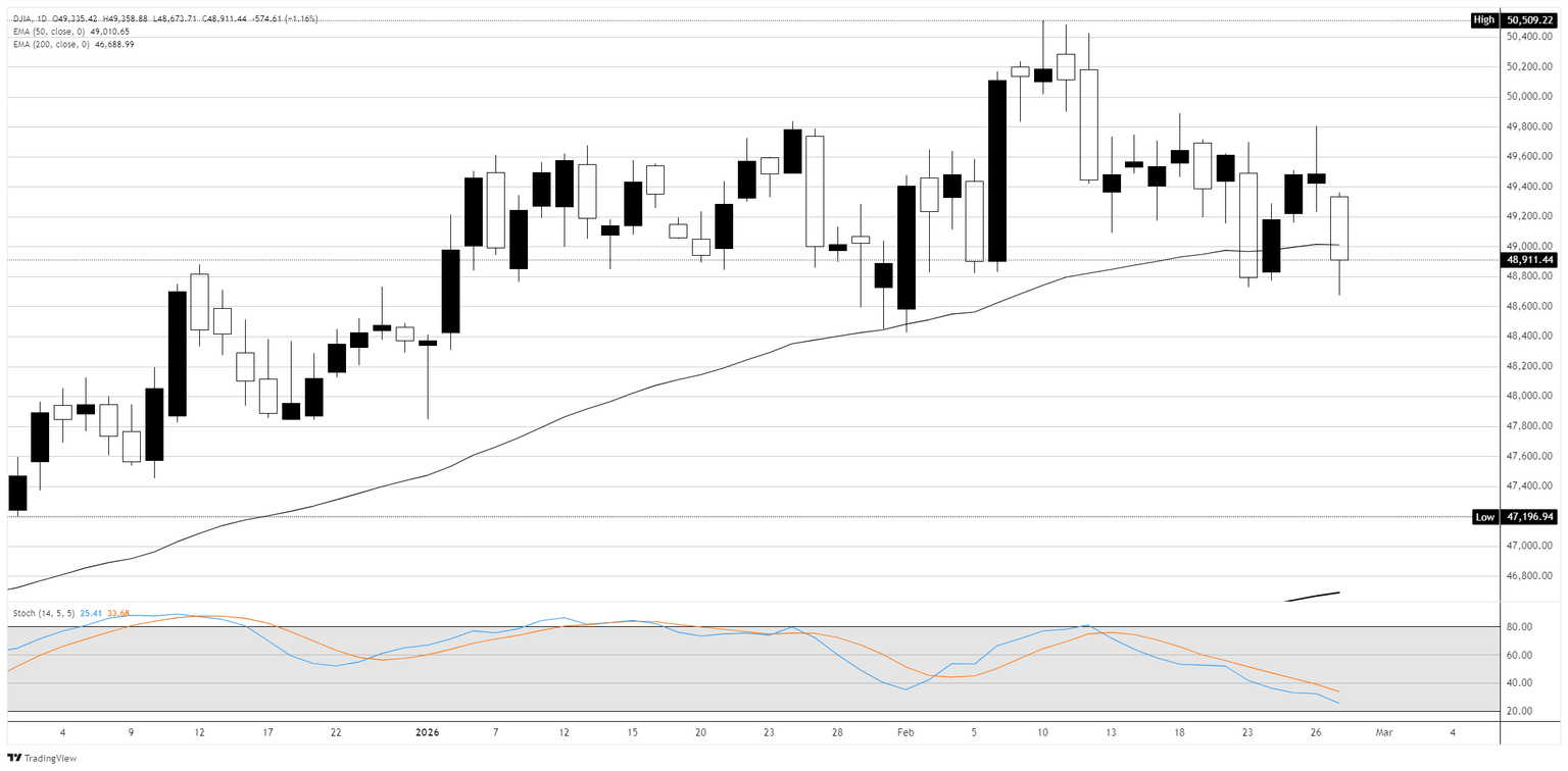 El Promedio Industrial Dow Jones cayó 600 puntos, o un 1.15%, retrocediendo por debajo de 49,000 el viernes, cerrando una turbulenta última semana de negociación en febrero. El S&P 500 bajó alrededor de un 0.7% mientras que el Nasdaq Composite perdió aproximadamente un 0.9%. Los tres índices terminaron febrero en rojo, lastrados por una combinación de datos de inflación persistente, temores de interrupciones por IA y toma de beneficios en el sector tecnológico tras las ganancias de Nvidia a principios de semana.