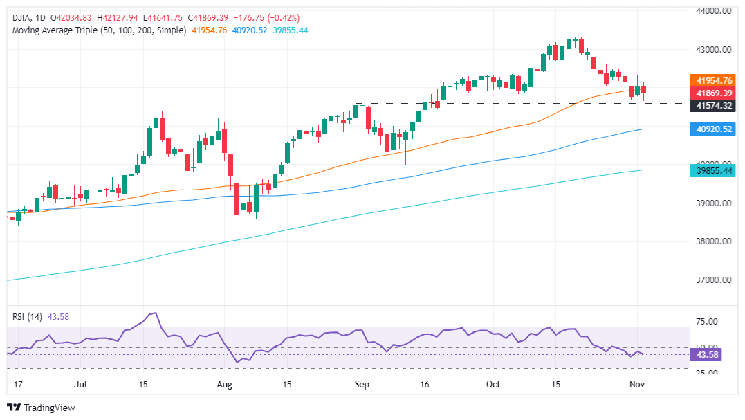 El Promedio Industrial Dow Jones ha caído por debajo del umbral de 42.000 después de alcanzar un pico de dos días de 42.328. En su camino hacia abajo, el DJIA superó la media móvil simple (SMA) de 50 días en 41.953, abriendo la puerta a más caídas.
