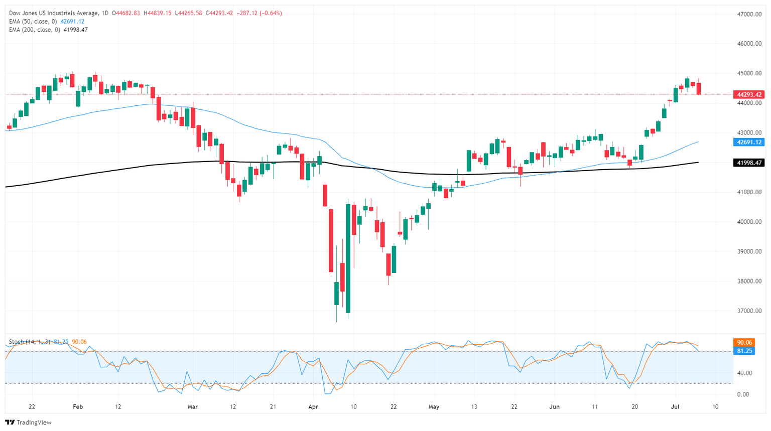 El Dow sigue subiendo un 21% desde el mínimo posterior a los aranceles de abril cerca de 36.600, y el siguiente objetivo técnico son nuevos máximos históricos por encima de 45.000. En el lado bajo, el soporte técnico a corto plazo está valorado en la media móvil exponencial (EMA) de 50 días, estacionada justo por debajo de 43.000.