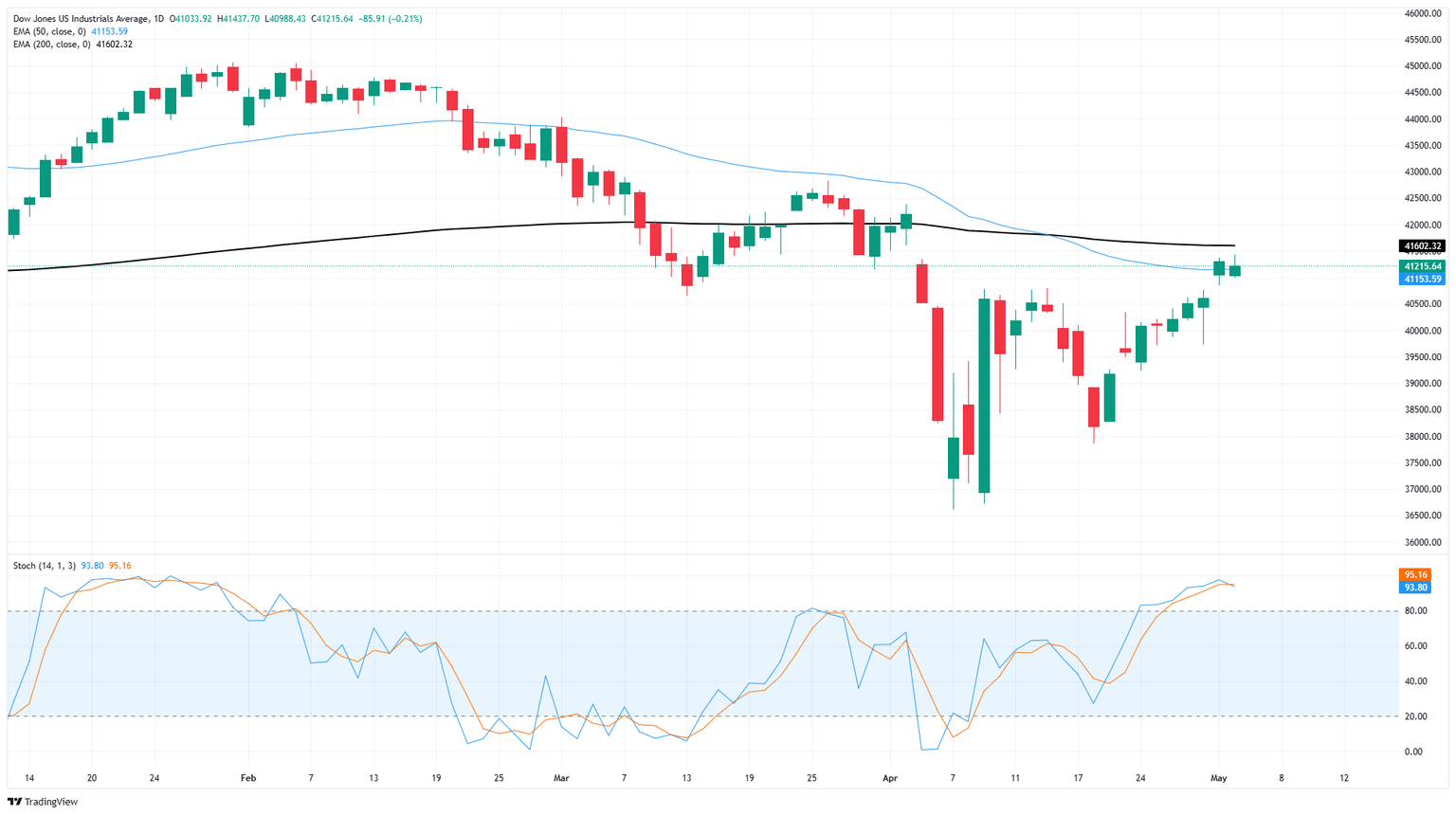 El empuje alcista cauteloso pero decidido del lunes ha acercado las ofertas aún más a la media móvil exponencial (EMA) de 200 días cerca de 41,600. El Dow Jones ha recuperado casi un 9.5% desde su mínimo del 21 de abril de 37,853, cerrando en verde en todos menos dos de los últimos nueve días de negociación consecutivos.