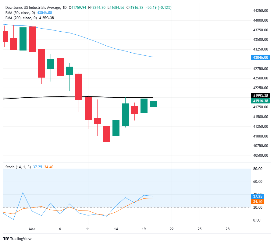 El Dow Jones continúa girando justo al sur de los niveles de precios clave, marcando varios intentos fallidos de volver a superar la media móvil exponencial (EMA) de 200 días cerca de la zona principal de 42.000. La acción del precio sigue inclinándose a favor de los compradores, pero la falta de impulso alcista está manteniendo las ofertas limitadas por un nuevo techo técnico.