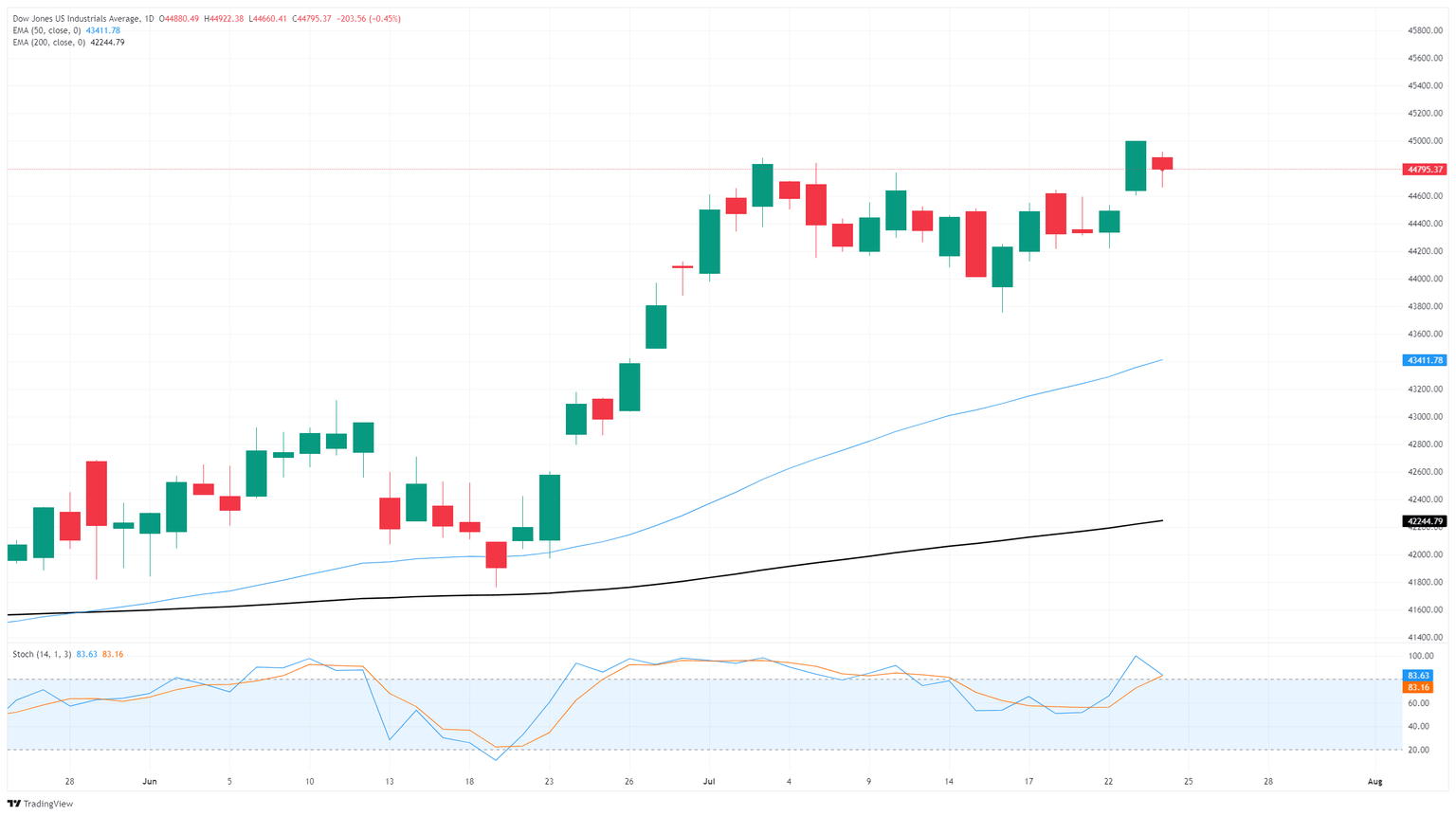 La acción del precio del jueves ha dejado al Dow Jones atrapado en niveles de congestión a corto plazo a pesar de una inclinación general alcista del índice bursátil principal. El Dow sigue atrapado justo al sur de los máximos históricos por encima de la zona de 45.000, pero el impulso en la parte superior continúa luchando por hacer progresos significativos.