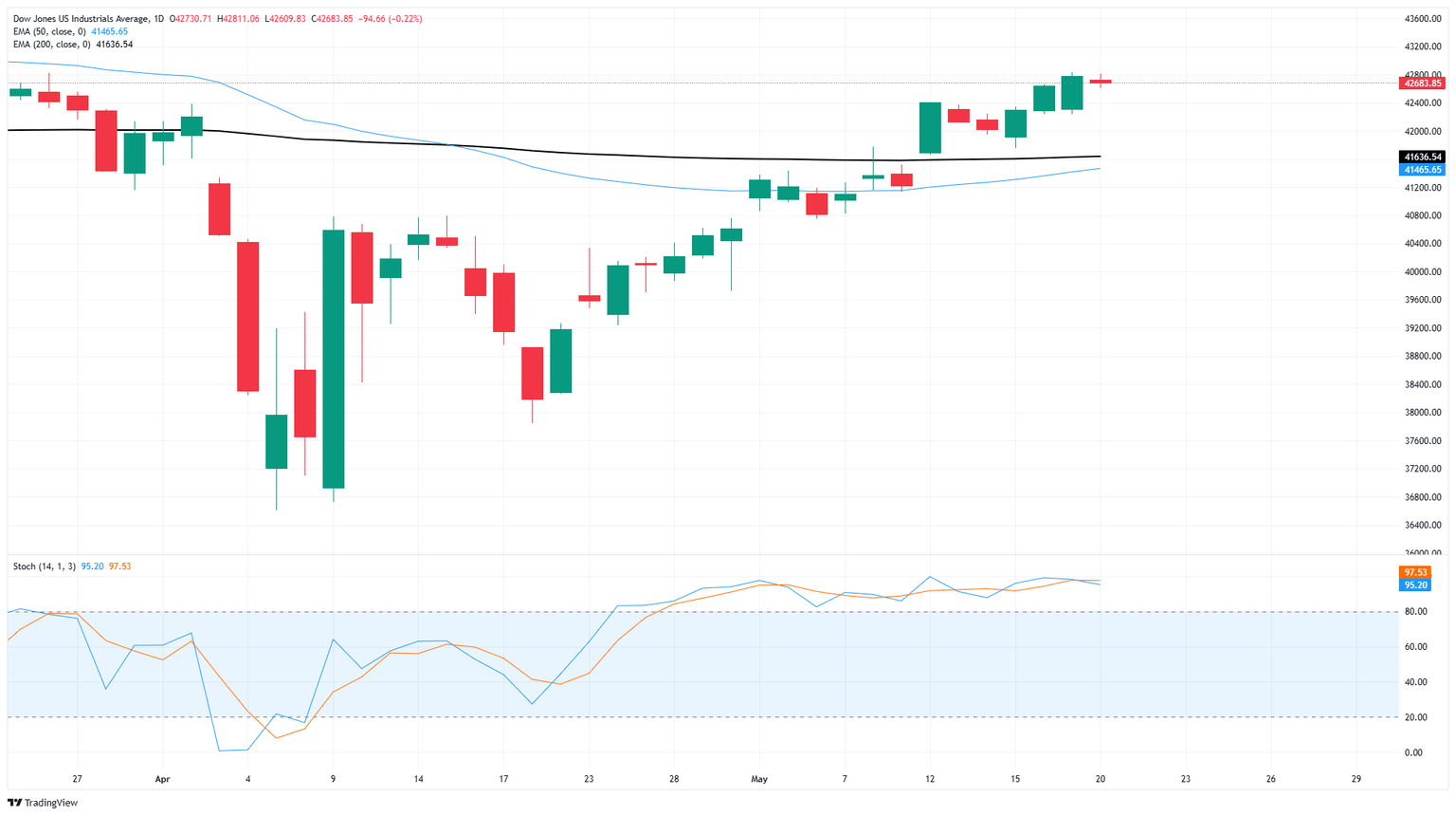 A pesar de la actividad más fría del mercado el martes, el índice bursátil principal ha cerrado al alza durante cuatro semanas consecutivas y está en camino de una quinta semana alcista consecutiva tras un fuerte inicio esta semana. El Dow Jones ha continuado subiendo por encima de la media móvil exponencial (EMA) de 200 días alrededor de 41.500, y ha aumentado casi un 17% desde la caída inducida por aranceles de abril que vio al DJIA caer a 36.600.