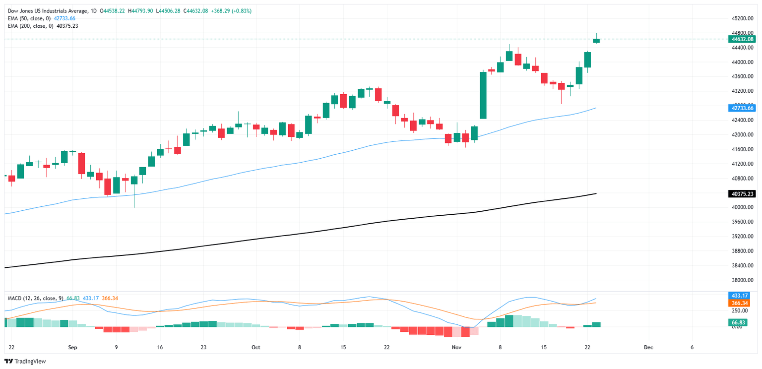 La oferta del Dow Jones del lunes en un nuevo récord histórico cercano a 44.800 ha dejado al índice de primera línea nuevamente en el lado alto de una corrida alcista a corto plazo, desechando una reciente caída a la baja mucho antes de que pudieran formarse indicadores técnicos bajistas. El Dow Jones ha subido casi un 19% de abajo hacia arriba en 2024, y ha subido un asombroso 32% desde que las velas japonesas diarias tocaron por última vez la media móvil exponencial (EMA) de 200 días en noviembre de 2023 cerca de la región de 33.800.