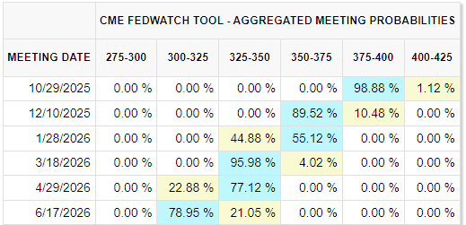 Por el momento, los observadores de tasas siguen firmemente afianzados en su fe en dos recortes más de tasas antes de que finalice el año. En el actual recorte, la herramienta FedWatch del CME muestra que los apostadores de tasas ven una escasa probabilidad del 1% de que la Fed mantenga las tasas de interés sin cambios en su próxima reunión de establecimiento de tasas, que concluye el 29 de octubre.