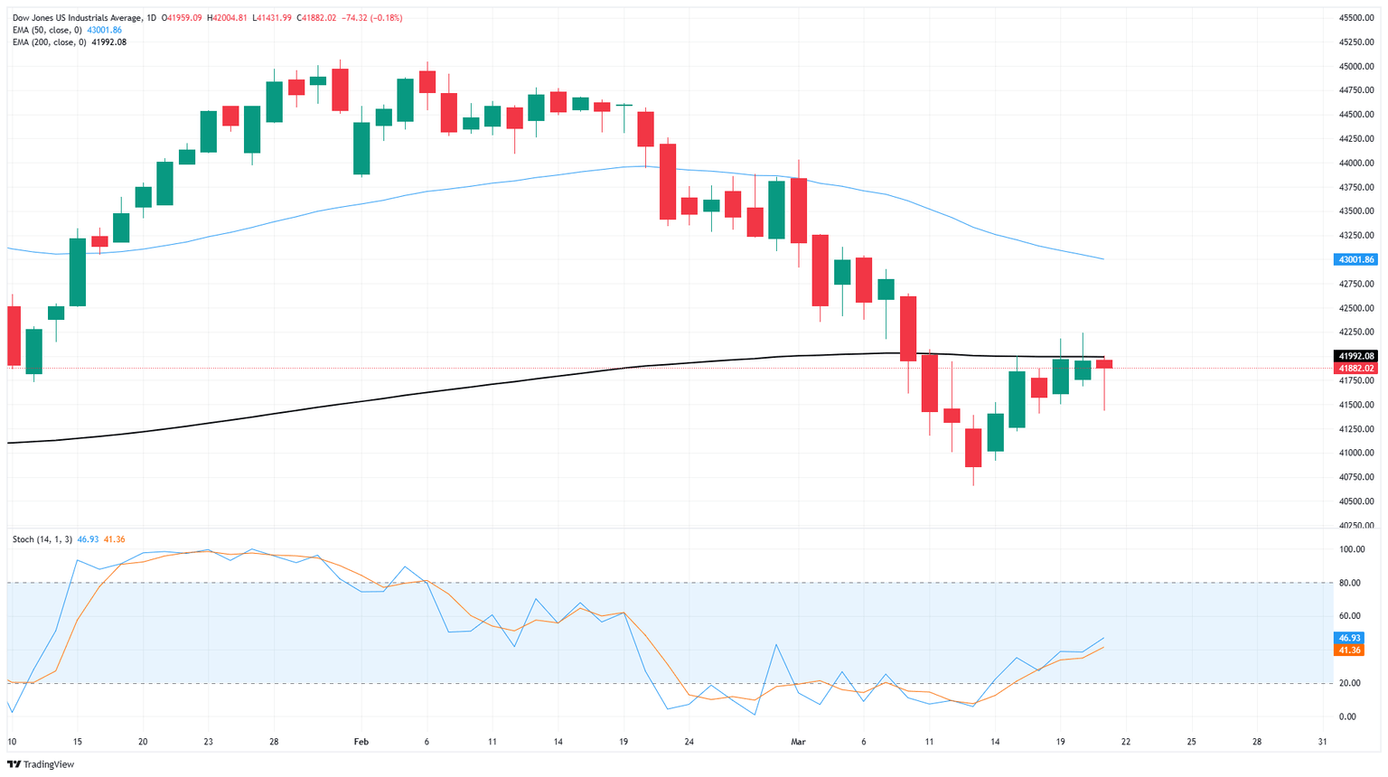 El Promedio Industrial Dow Jones (DJIA) vio un aumento en la volatilidad el viernes, pero se asentó cerca de donde comenzó, cerca de 42.000, mientras los inversores luchan por decidir hacia dónde ir a continuación. A pesar de una presentación relativamente delgada en la agenda de datos económicos, el sentimiento del mercado sigue siendo tenso mientras los operadores lidian con nuevas inconsistencias del presidente estadounidense Donald Trump.