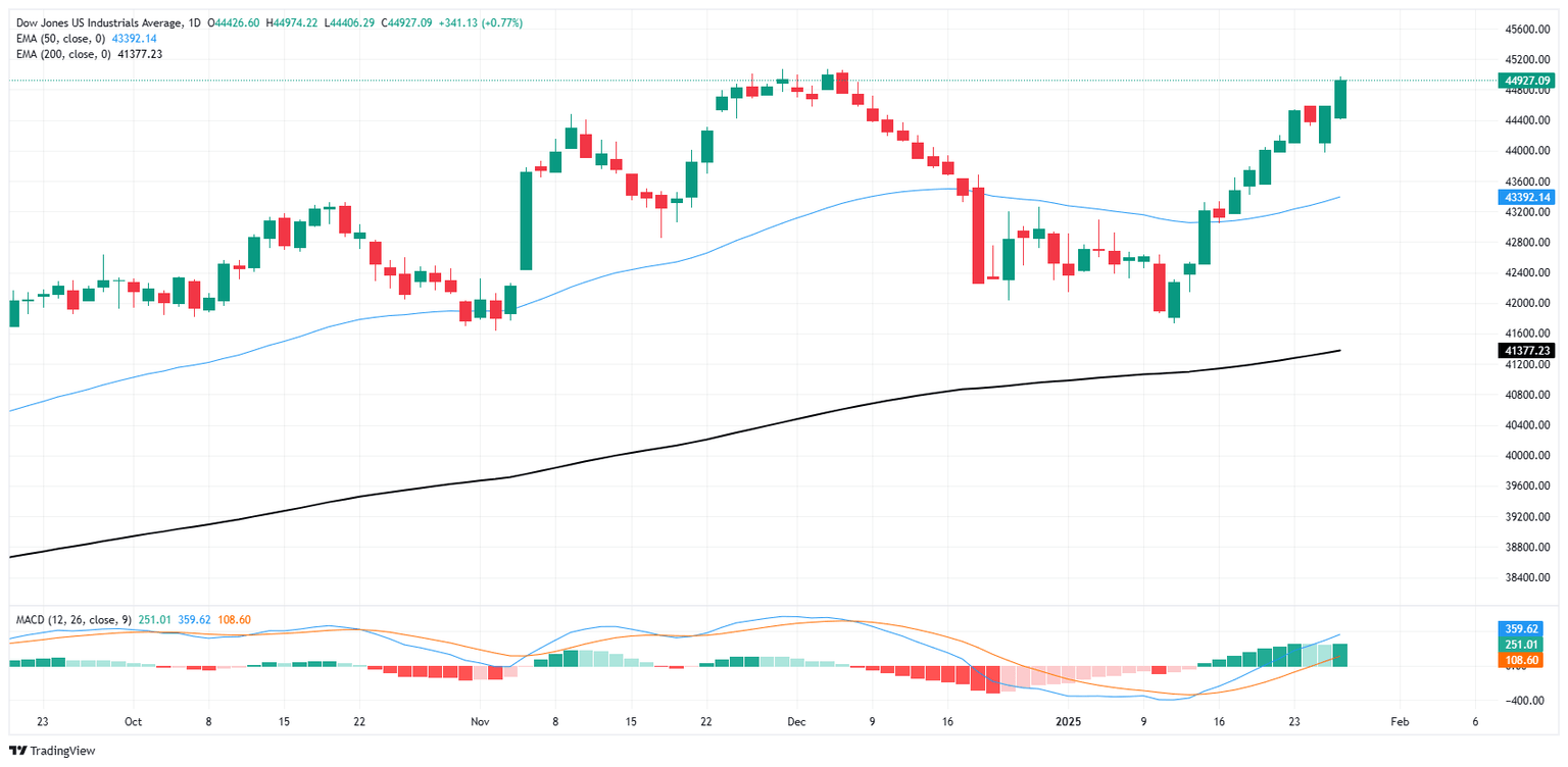El Promedio Industrial Dow Jones (DJIA) subió alrededor de 250 puntos el martes en su punto más alto, subiendo medio punto porcentual antes de estabilizarse en una subida de +150 puntos en el día, y registrando un nuevo máximo de ocho semanas mientras los inversores desestiman la nueva volatilidad ante las renovadas amenazas de guerra comercial del presidente de Estados Unidos (EE.UU.), Donald Trump. La última decisión de tasas de la Reserva Federal (Fed) está en la agenda para esta semana. Mientras los operadores siempre están atentos a señales de futuros recortes de tasas por parte de la Fed, la atención del mercado se ha dividido entre una nueva ronda de aranceles amenazados por el presidente Trump y el sector tecnológico dominado por nuevos participantes chinos en el espacio.