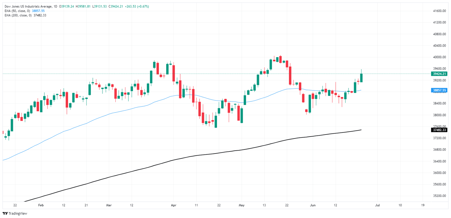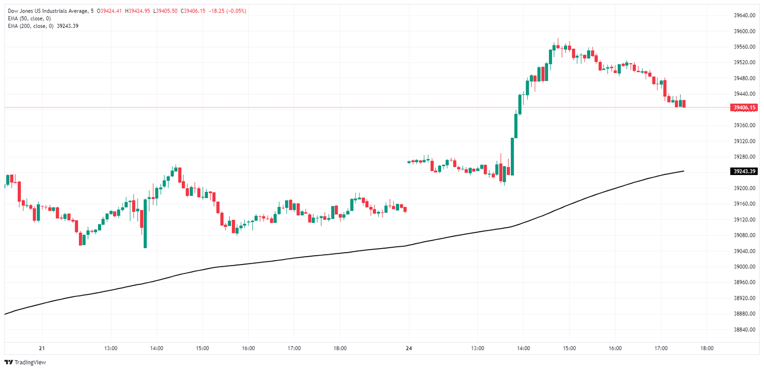 El Dow Jones probó un nuevo máximo de cinco semanas el lunes, alcanzando los 39.581,81 antes de enfriarse en la segunda mitad de la sesión del mercado estadounidense. El índice ha subido un 4% después de tocar un fondo a corto plazo en la zona de 38.000,00.
