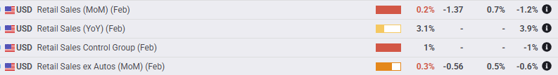 Las ventas minoristas de EE.UU. repuntaron a un tibio 0.2% intermensual en febrero tras la caída de enero. Los mercados esperaban un mejor desempeño de los resultados de la actividad minorista clave, con una previsión mediana del 0.7%. Los observadores de datos notarán que la cifra de enero también fue revisada a un mínimo de dos años de -1.2%, y las revisiones a la baja seguirán afectando el calendario económico a medida que los datos de EE.UU. continúan empeorando en el extremo frontal de la curva.