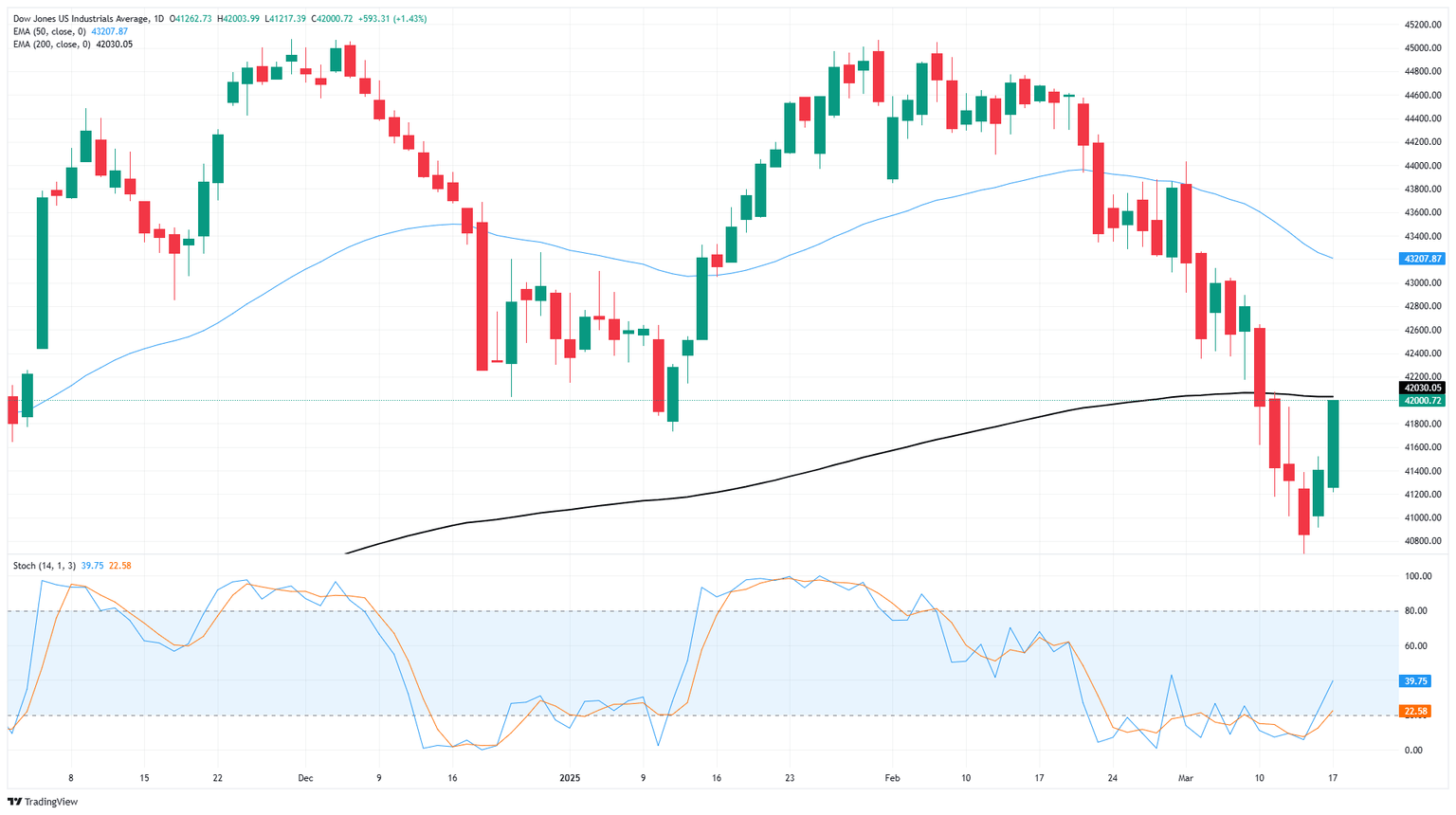 La presión de compra está empujando al Dow Jones de regreso hacia la media móvil exponencial (EMA) de 200 días en el nivel de 42,000. El DJIA encontró un suelo técnico en el nivel de precio clave de 41,000, pero los compradores permanecen en el extremo bajo de un agujero particularmente empinado mientras el Dow cotiza 3,300 puntos por debajo de los máximos históricos establecidos el noviembre pasado justo al norte de 45,000.