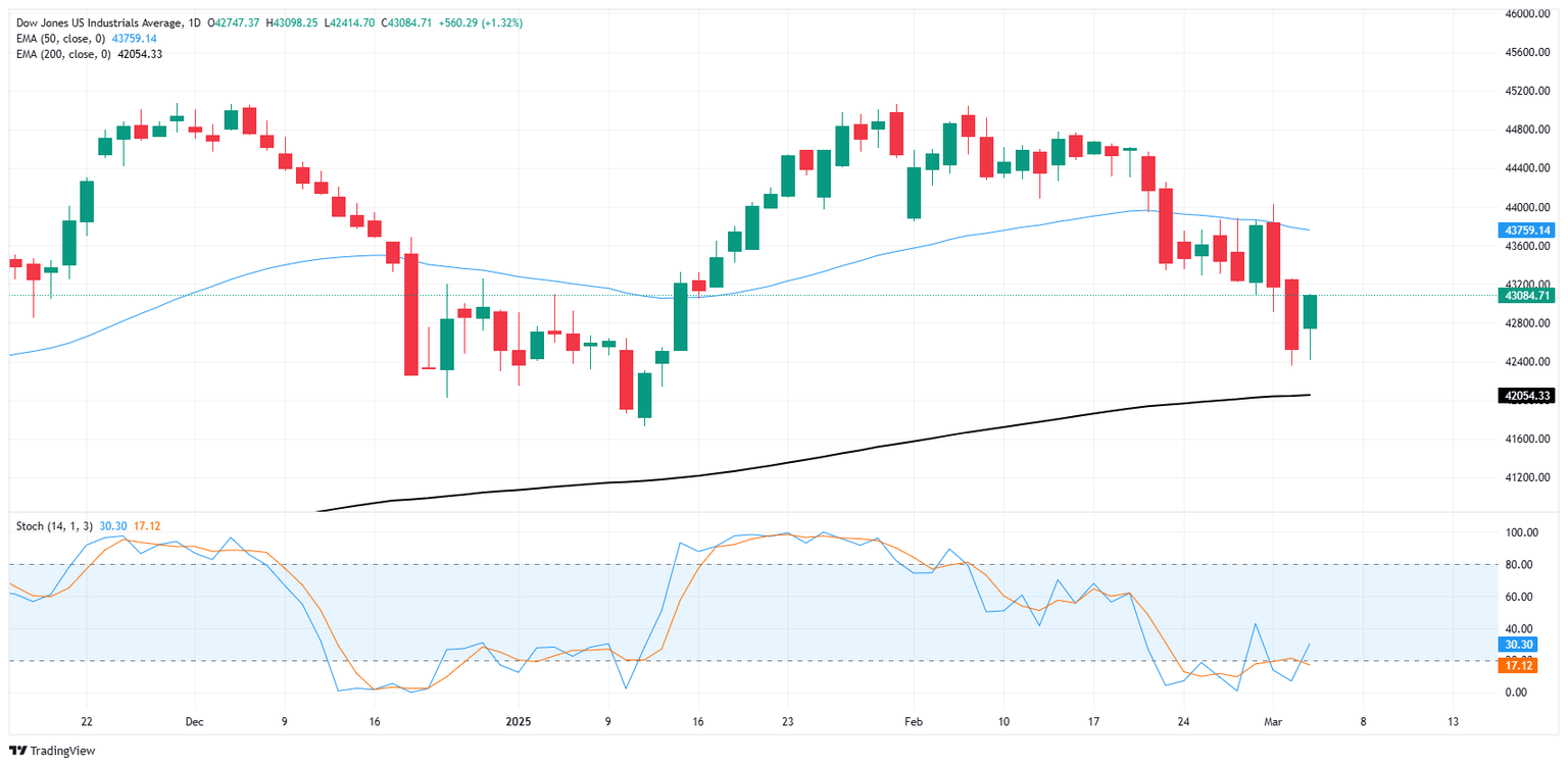 El Promedio Industrial Dow Jones (DJIA) rebotó tras la pronunciada caída de dos días de esta semana, recuperando terreno mientras los inversores intentan sostener el mercado. Las acciones sufrieron un golpe después de que el presidente de Estados Unidos (EE.UU.), Donald Trump, finalmente dejara que sus propios aranceles sobre Canadá, México y China entraran en vigor, pero los inversores esperan otra ronda de concesiones y retrasos para aliviar las presiones de la guerra comercial.