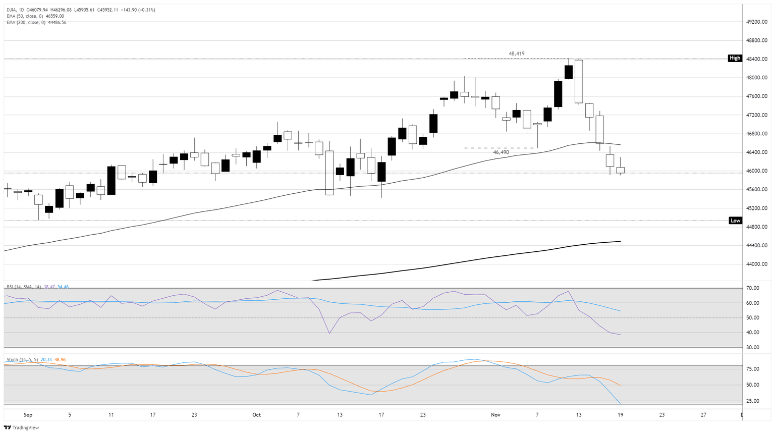 - El Dow Jones está luchando por encontrar un punto de apoyo cerca de 46.000.