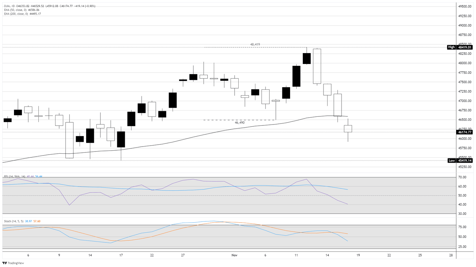 El Promedio Industrial Dow Jones enfrentó una renovada presión a la baja el martes, cayendo 680 puntos desde el cierre del día anterior en su nivel más bajo antes de encontrar un soporte técnico tibio cerca de 46.255. El índice bursátil principal ha entrado en su cuarto día consecutivo de tendencia bajista mientras los inversores enfrentan vientos en contra en múltiples frentes.