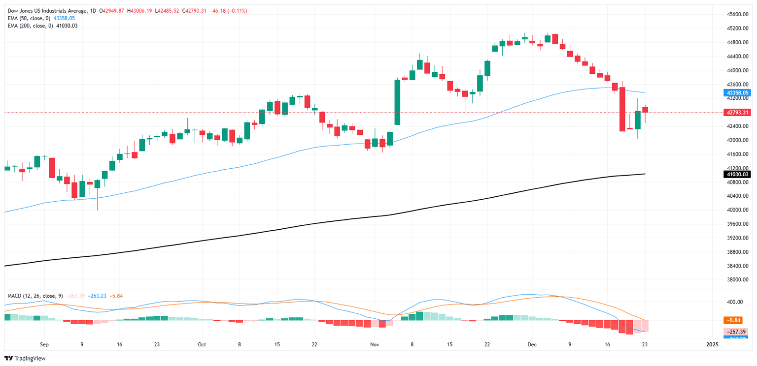El Promedio Industrial Dow Jones (DJIA) se debilitó al comenzar la semana de negociación navideña, cayendo un poco más de 200 puntos en su punto más bajo antes de una leve recuperación a -50 puntos el lunes. El Dow Jones está lidiando con territorio gráfico al sur de 43.000 tras un retroceso de diez días que arrastró al principal índice de acciones por debajo de las ofertas récord por encima de 45.000.