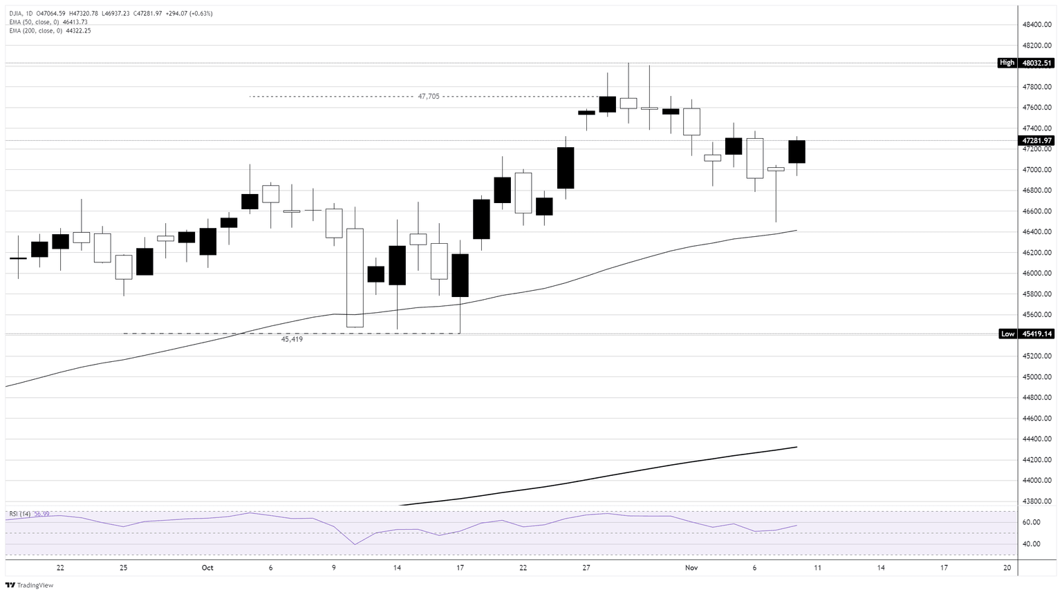 - El Dow Jones se mantiene estable cerca de 47.000 mientras los inversores buscan el fin del cierre federal.