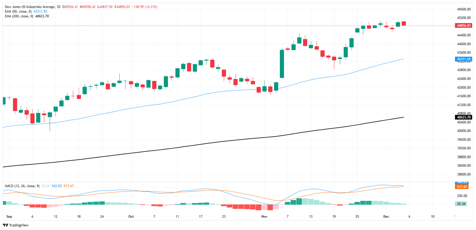 El Promedio Industrial Dow Jones (DJIA) retrocedió ligeramente el jueves, bajando alrededor de 250 puntos en su nivel más bajo y manteniendo la acción del precio en un tenso enfrentamiento con la zona de precio principal de 45.000. Los mercados se están preparando para el próximo informe de Nóminas no Agrícolas (NFP) del viernes, y los inversores están cada vez más inquietos después de una serie de expectativas no cumplidas en las cifras preliminares de empleo.