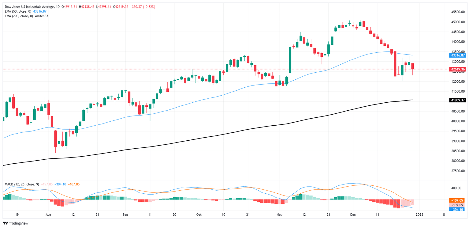 El Promedio Industrial Dow Jones (DJIA) perdió más de 300 puntos el lunes, cayendo a un mínimo a corto plazo justo al sur de 42.300 antes de una recuperación a medias de vuelta a 42.500 mientras las acciones se desploman en uno de los últimos días de negociación del año. El rally tecnológico, impulsado por expectativas aún más altas de los inversores hacia un futuro impulsado por la IA, parece estar a punto de drenar los mercados por el momento.