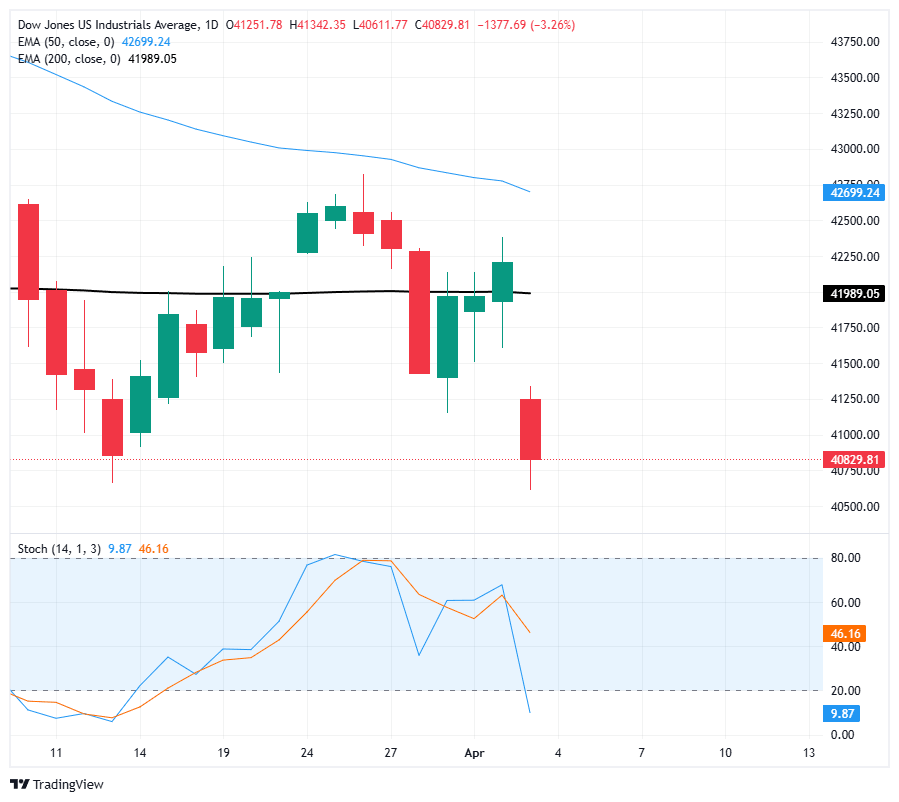 El Promedio Industrial Dow Jones (DJIA) tocó fondo cerca del nivel 40,800 después de sufrir una fuerte caída durante los mercados nocturnos. El sentimiento de los inversores ha oscilado ante el paquete de aranceles de gran alcance anunciado esta semana por la administración Trump, llevando a las acciones a nuevos mínimos.