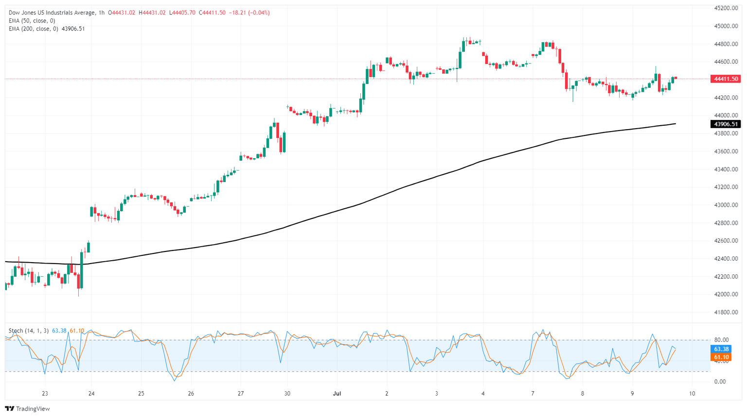 El Dow Jones sigue en el lado bajo de la acción del precio de la semana, deslizándose a lo largo de un nuevo piso técnico cerca de 44.250. El Dow sigue en el lado norte de la media móvil exponencial (EMA) de 200 horas cerca de la zona de 44.000, pero las caídas a corto plazo podrían acelerarse si el impulso alcista se toma una pausa demasiado larga.