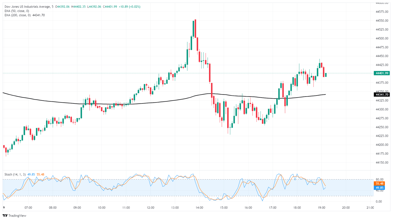 El miércoles fue un asunto agitado para el Dow Jones. Los continuos repuntes tecnológicos y la recuperación del sentimiento de los inversores impulsaron brevemente al índice bursátil principal a máximos intradía cerca de 44.560 antes de que las nuevas amenazas arancelarias enviaran al Dow Jones a mínimos cerca de 44.240. A pesar de la volatilidad intradía, el Dow se está negociando en el extremo alto de las ofertas de apertura del día cerca de 44.200.
