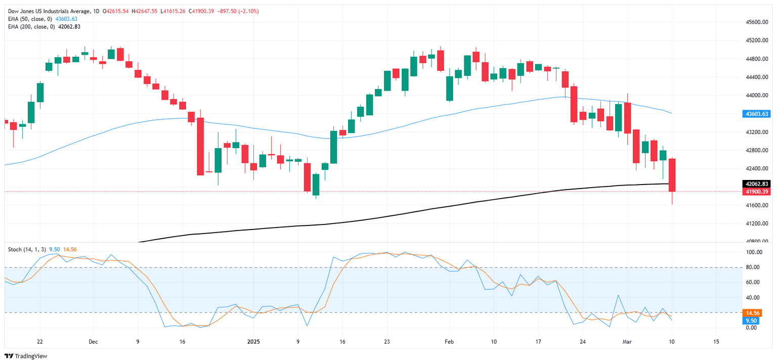 El Promedio Industrial Dow Jones atravesó la Media Móvil Exponencial (EMA) justo por debajo del nivel de precio principal de 42.000 por primera vez desde noviembre de 2023, alcanzando la media móvil principal por primera vez en más de dos años y poniendo fin a la impresionante racha del Dow de superar su propia media móvil a largo plazo. El Dow Jones alcanzó un nuevo mínimo de 8 semanas el lunes, sumando a la caída del 6.55% del índice de acciones principal desde el último máximo de oscilación justo por encima del nivel de 45.000.