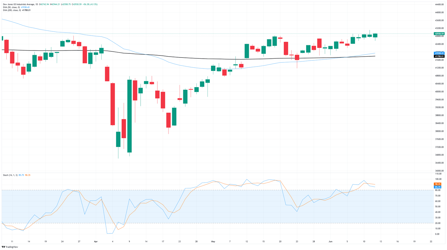 El impulso alcista del jueves mantiene al Promedio Industrial Dow Jones dentro del rango de contacto de la zona de precios principal de 43.000, pero el impulso significativo sigue siendo limitado. La acción del precio continúa estancándose en una reciente zona de congestión, y el índice bursátil principal está luchando por poner distancia entre las ofertas y la media móvil exponencial (EMA) de 200 días cerca de 41.780.