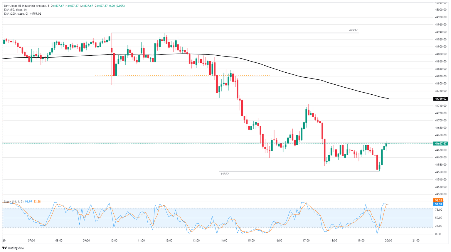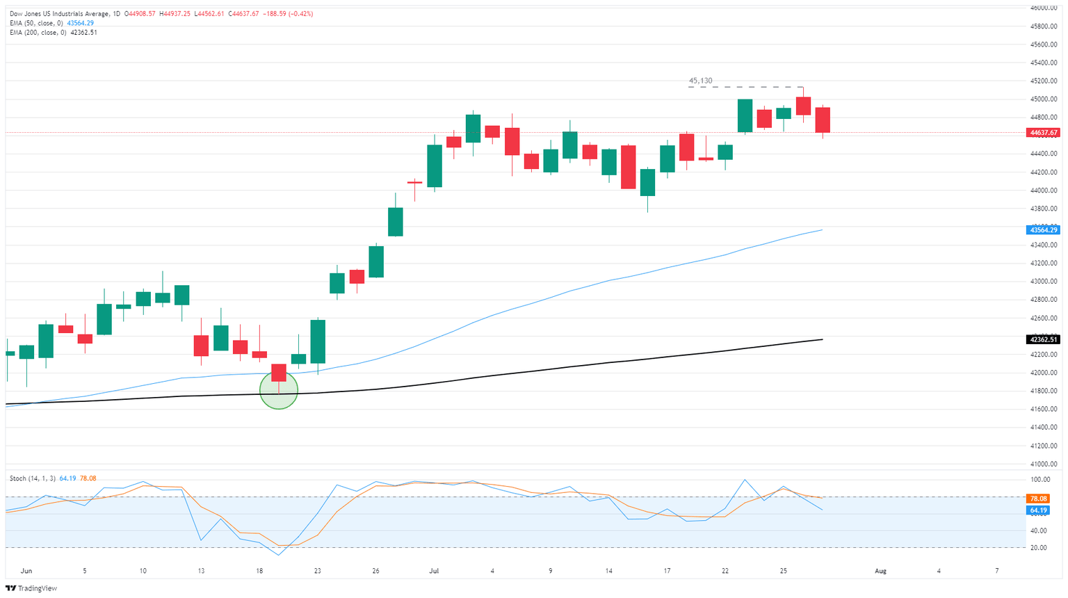 El Dow Jones cayó por debajo de 44.800, perdiendo alrededor de 200 puntos y retrocediendo cuatro décimas de uno por ciento en el día. La presión bajista continúa acumulándose, restringiendo más alzas después de que el Dow alcanzara un máximo intradía récord de 45.130 a principios de esta semana. Los gráficos aún están recibiendo soporte técnico de una zona de congestión desordenada al norte de 44.000, pero los operadores deben esperar que la acción del precio esté impulsada por los titulares esta semana.