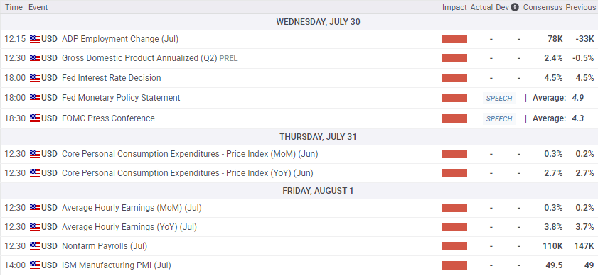 Además de una decisión sobre tasas de la central más poderosa del mundo, los inversores también se enfrentarán a una actualización del PIB de EE.UU. a primera hora del miércoles. El crecimiento del PIB trimestral de EE.UU. se registró en un decepcionante -0.5% en el primer trimestre, y los mercados esperan una fuerte recuperación al 2.4% en crecimiento anualizado en el segundo trimestre.