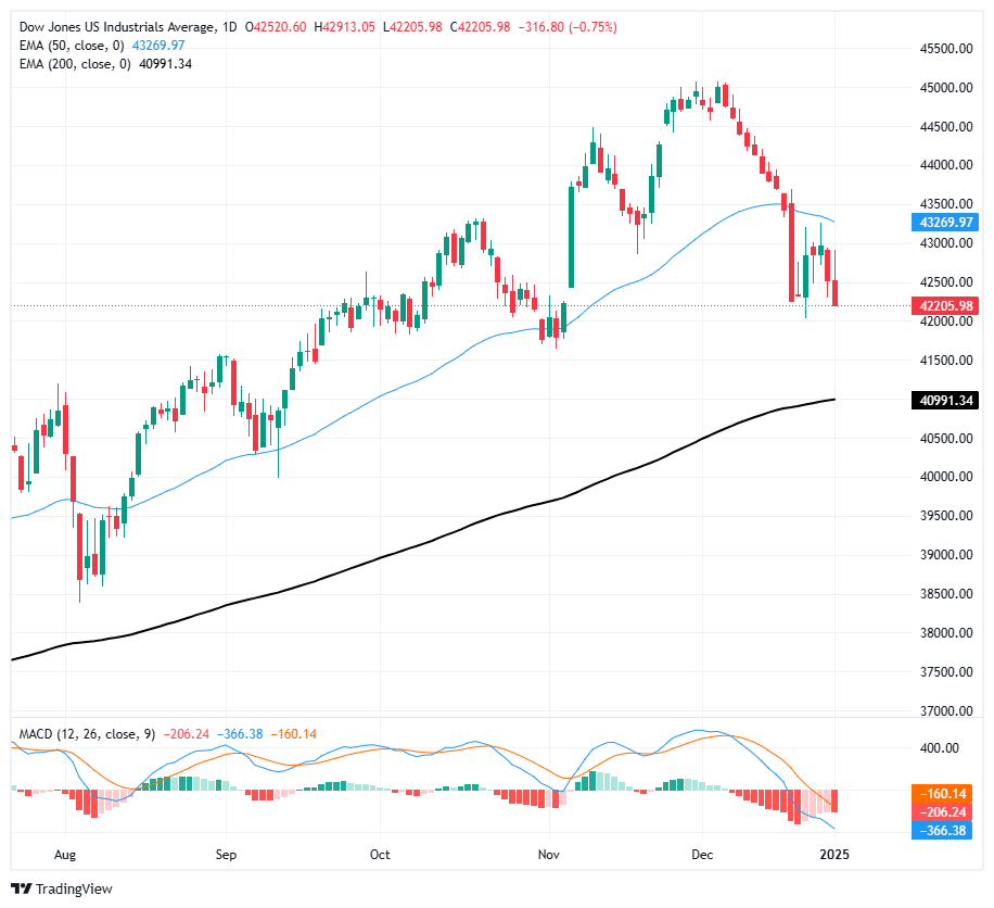 Los flujos bajistas del final de 2024 continúan en el nuevo año, manteniendo al Dow limitado por debajo de la media móvil exponencial (EMA) de 50 días, que está girando hacia una postura bajista por debajo de 43.270. Si el impulso bajista se acelera, pondrá al DJIA en camino de un nuevo desafío de la EMA de 200 días cerca de 42.120.