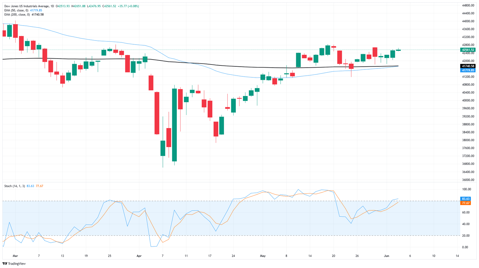 El Promedio Industrial Dow Jones está atravesando una fase de consolidación justo al norte de la media móvil exponencial (EMA) de 200 días. La acción del precio permanece atrapada en un rango a corto plazo entre 42.000 y 43.000. El impulso aún se inclina hacia el alza, pero la falta de progreso junto con osciladores técnicos que están probando territorio de sobrecompra podrían señalar un retroceso técnico por debajo de las medias móviles a largo plazo.