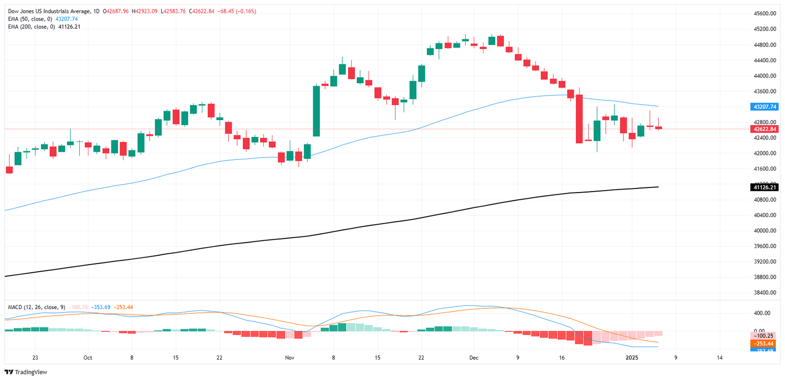 Un patrón de consolidación áspero se está cocinando en el gráfico del Dow Jones, manteniendo al principal índice bursátil cojeando en un rango agitado entre 43.000 y 42.000. La presión de venta sigue sin poder empujar la acción del precio firmemente en una trayectoria a la baja, y las ofertas siguen reforzadas en un techo técnico desde el promedio móvil exponencial (EMA) de 50 días descendiendo a través de 43.200.