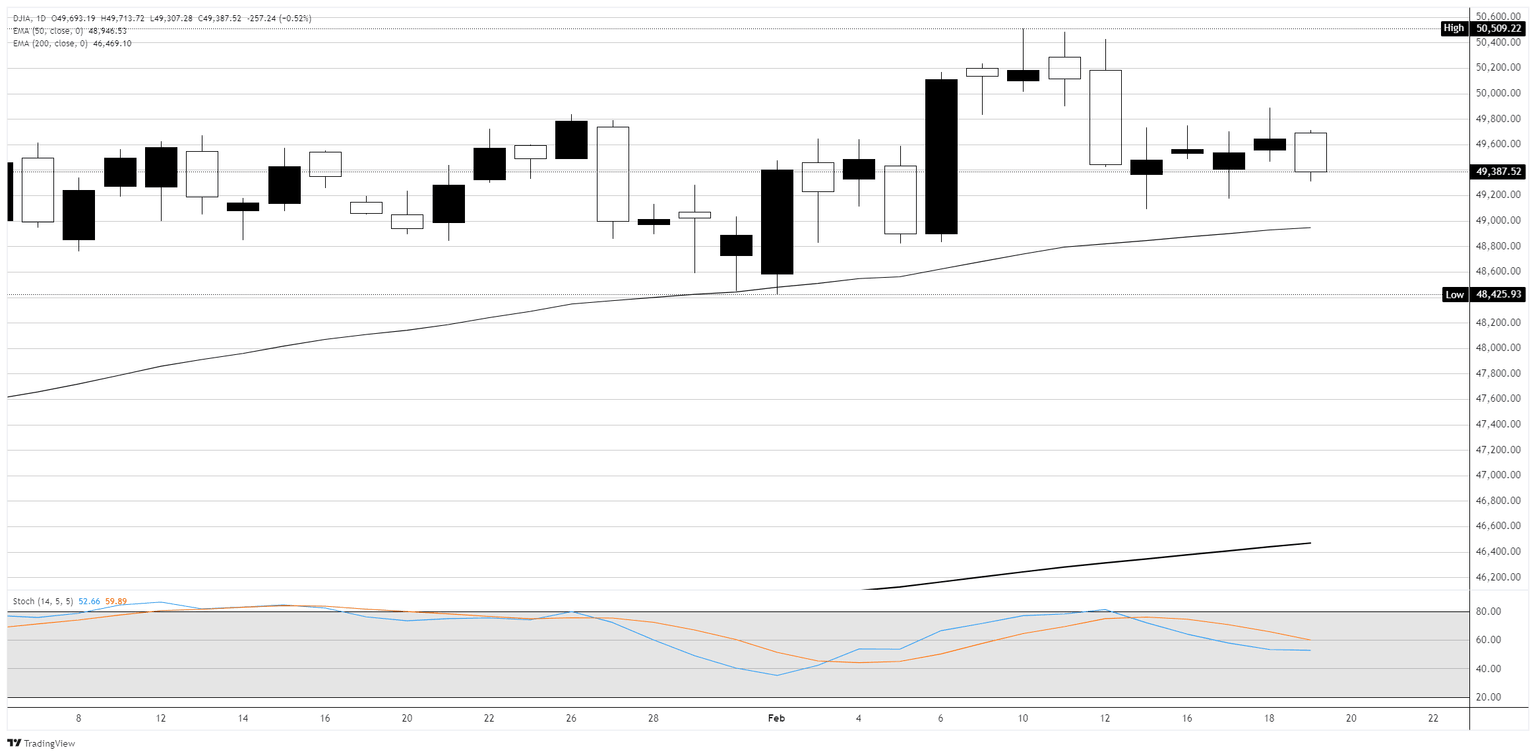El Promedio Industrial Dow Jones (DJIA) cayó casi 300 puntos, o 0.59%, retrocediendo a 49.351 el jueves, ya que una confluencia de riesgos geopolíticos, señales de línea dura de la Reserva Federal (Fed) y guías corporativas decepcionantes pesaron sobre el sentimiento. El S&P 500 (SP500) cayó un 0.3% mientras que el Nasdaq Composite bajó un 0.2%. Las pérdidas del jueves devolvieron una parte de las ganancias del miércoles, que habían sido impulsadas por un amplio repunte en los nombres tecnológicos de los Siete Magníficos y la fortaleza en los sectores financiero y energético. El DJIA se mantiene bien por encima de su Media Móvil Exponencial (EMA) de 50 días cerca de 48.944, pero se aleja aún más de los máximos históricos por encima de 50.500 establecidos a principios de este mes.