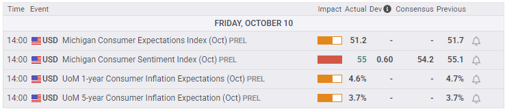 El Índice de Sentimiento del Consumidor de la Universidad de Michigan (UoM) cayó menos de lo esperado para el mes de octubre, proporcionando un ligero impulso a los inversores que se preparaban para un resultado mucho peor. Las Expectativas de Inflación del Consumidor a 1 año de UoM también bajaron al 4.6% desde el 4.7%, sin embargo, el componente a 5 años se mantiene elevado en 3.7%.