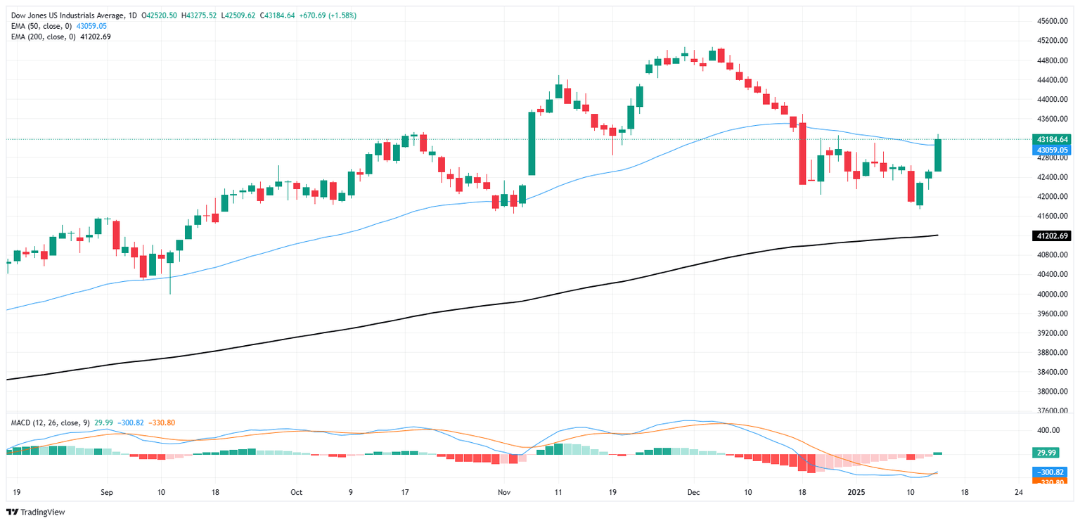 El último punto débil bajista del Dow Jones podría haber terminado ya que la acción del precio empuja de nuevo al norte del EMA de 50 días y recupera la zona de 43.000. El principal índice de acciones retrocedió a una zona de alarma justo por encima del EMA de 200 días cerca de 41.200, pero las cosas pueden estar volviendo a su camino alcista ahora que el Dow ha subido un 3.7% en solo tres días.