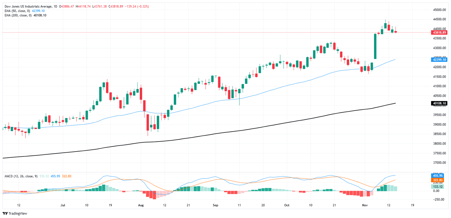 El Promedio Industrial Dow Jones (DJIA) frenó el reciente rally postelectoral que vio una victoria decisiva para el candidato presidencial y ex presidente Donald Trump. Los inversores percibieron abrumadoramente al contendiente que regresa a la Casa Blanca como un representante pro-mercado dentro del gobierno de EE.UU. El exceso de acciones en las elecciones ahora se está desvaneciendo a medida que las acciones retroceden ligeramente desde máximos históricos.